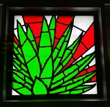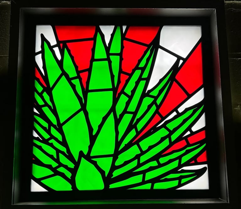 This is a custom project I created for Salud Eleven, a Mexican restaurant in Oak Park Michigan. The owner was looking for some type of window art. I figured that we should somehow utilize the light coming through the window, and create some type of stained glass looking artwork, combining wood and colored acrylic. We settled on an agave plants as the subject matter.